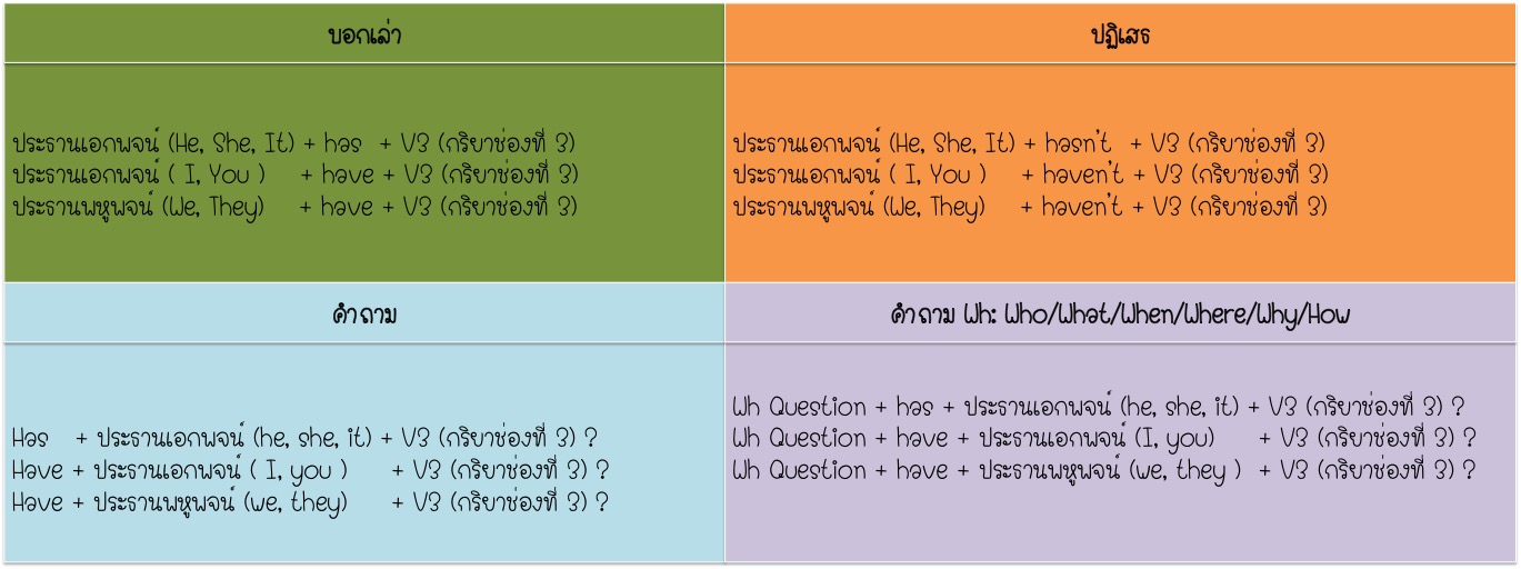 เล่าถึงการกระทำหรือสถานการณ์ที่เริ่มตั้งแต่อดีตและยังดำเนินอยู่ |