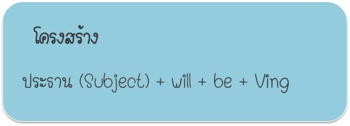 | Case 3 | ใช้เล่าถึงเหตุการณ์ในอนาคต 2 เหตุการณ์ที่เกิดขึ้นพร้อมกัน | ตัวอย่างเช่น She is going to be practicing piano and he is going be playing VDO game.