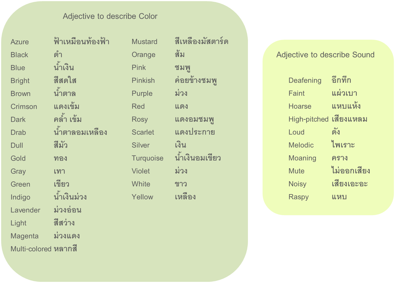คำที่ใช้บอกลักษณะ และคุณสมบัติ ส่วนใหญ่ของคำคุณศัพท์จะจัดอยู่ในกลุ่มนี้