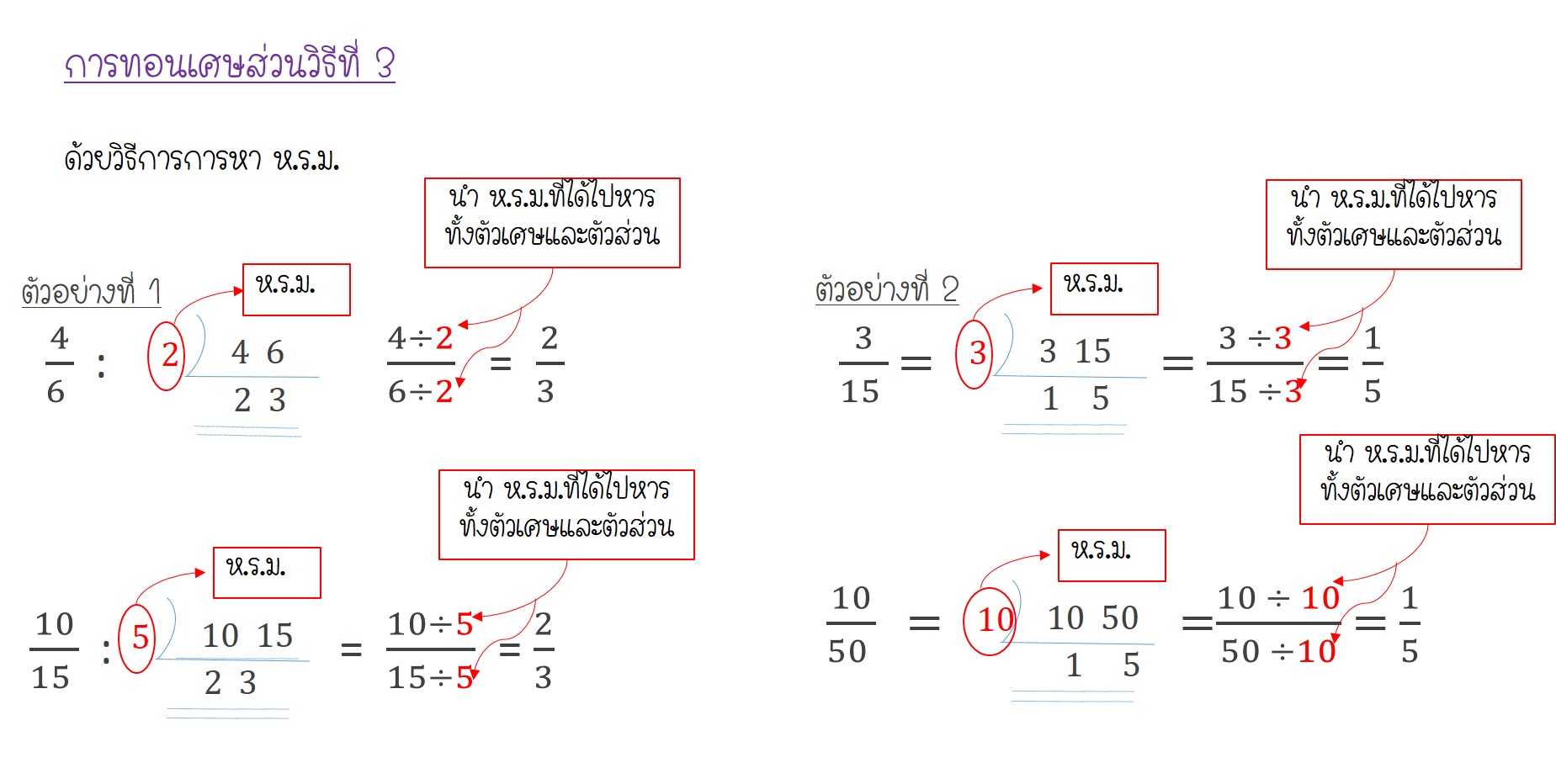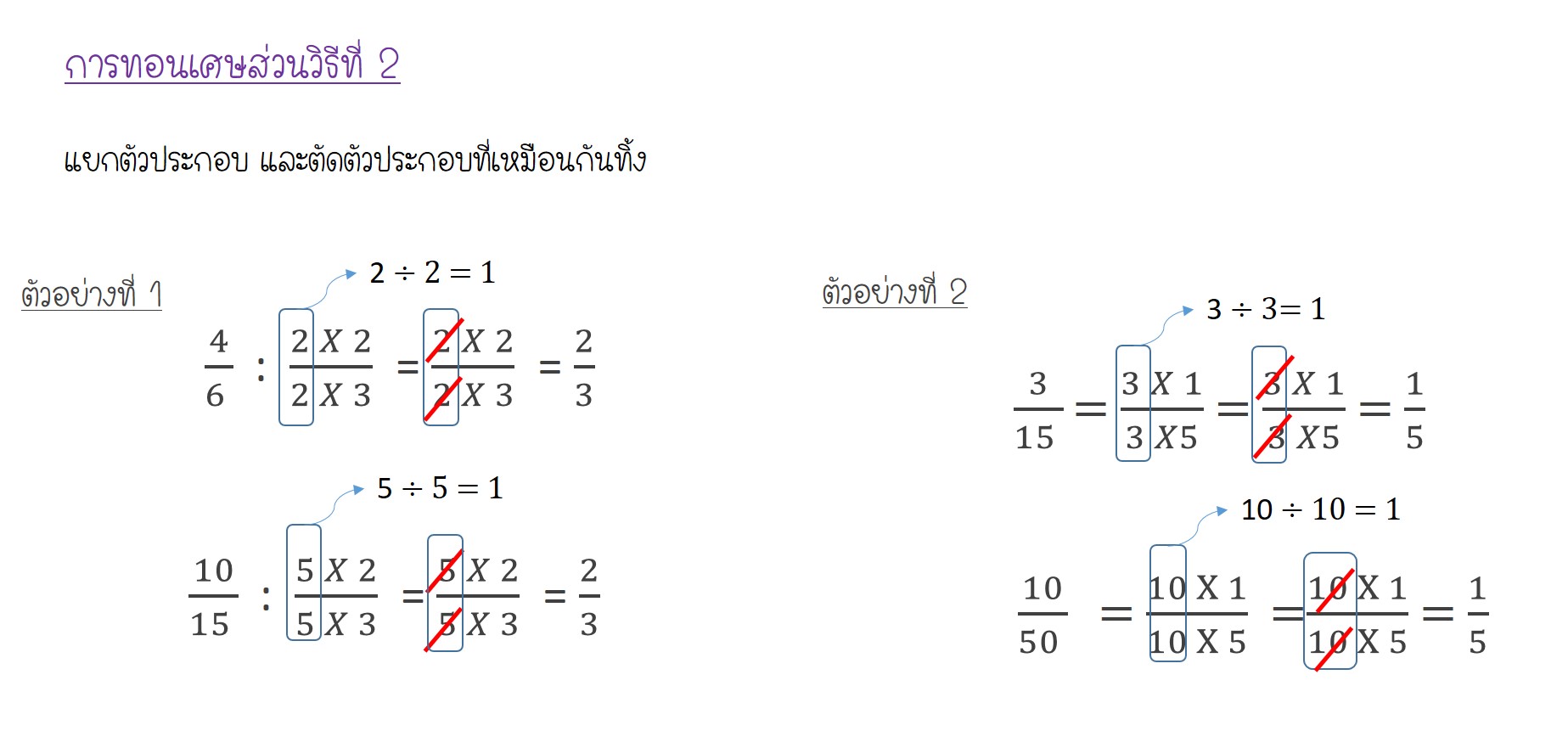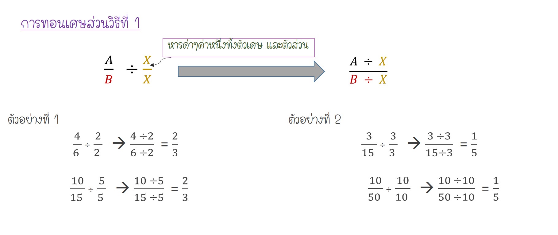 การทำให้เศษส่วนมีค่าน้อยลงทั้งตัวเศษและตัวส่วน โดยค่าของเศษส่วนมีจำนวนเท่าเดิมไม่เปลี่ยนแปลง