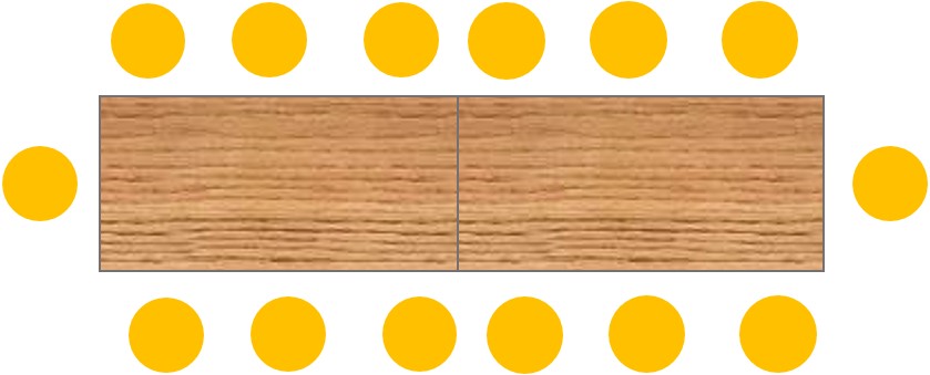 ถ้ามีโต๊ะ 2 ตัวต่อกันด้านกว้าง จะใช้เก้าอี้: (2 × 6) + 2 = 14 ตัว