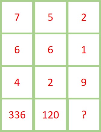 สังเกตคอลัมน์ที่ 1 จะเห็นว่า 336 มาจาก 7 × 6 × 4 × 2 (โดยที่ 7, 6, 4 มาจากคอลัมน์ที่ 1)